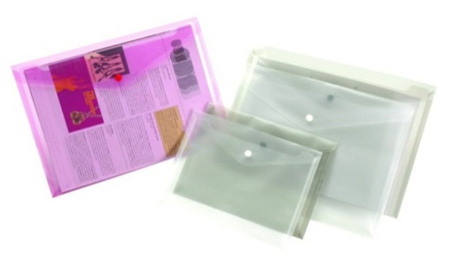 Sobre plástico portadocumentos tamaño A5, ideal para guardar y proteger papeles, tickets, boletas, apuntes u otros documentos pequeños. Fabricado con material resistente y cierre a presión tipo broche, brinda una solución práctica y segura para mantener todo en orden.
