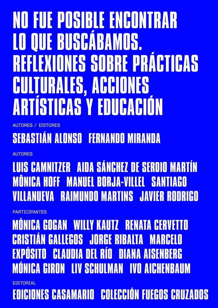 Una nueva publicación de Ediciones CasaMario, colección Fuegos cruzados, comisionado el trabajo a sus autores: Sebastián Alonso y Fernando Miranda; con la participación en sus siete capítulos de Luis Camnitzer, Aida Sánchez de Serdio, Mônica Hoff, Manuel Borja-Villel, Santiago Villanueva, Raimundo Martins y Javier Rodrigo Montero; en cada capítulo se incluyen textos y conversaciones de Jessica Gogan, Willy Kautz, Renata Cervetto y Cristián G.; parte con un comienzo incierto, derivado de antecedentes vinculados al Proyecto CasaMario y al Núcleo de Investigación en Cultura Visual de Bellas Artes de la Universidad de la República; durante la preparación no había pretensión de finalización ni resultado esperado; recoge acciones anteriores de colaboración con docentes, investigadores y también con instituciones culturales autogestionadas que construyen sentido social